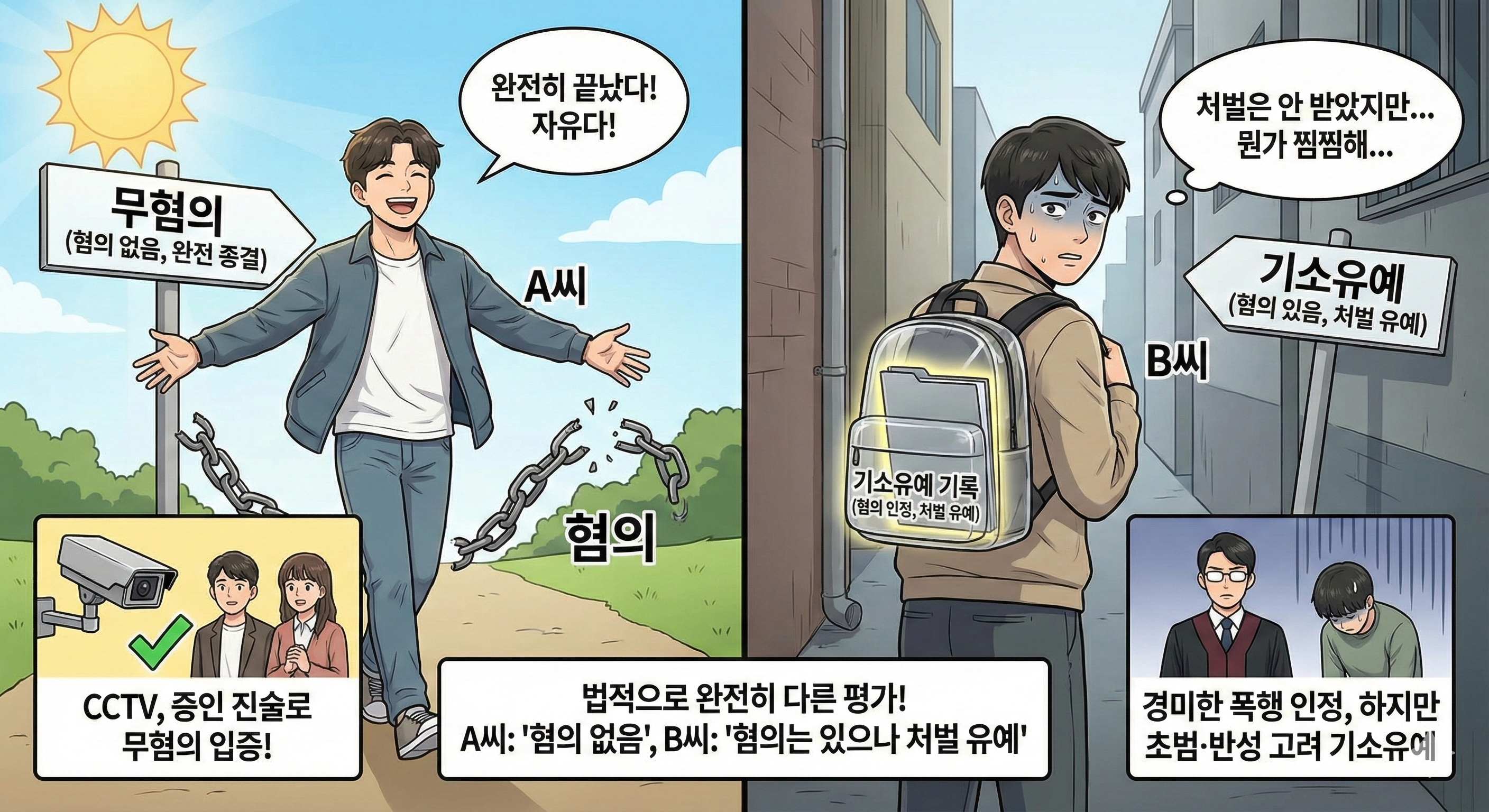법적으로 A씨는 “혐의 없음”, B씨는 “혐의는 있으나 처벌 유예”라는